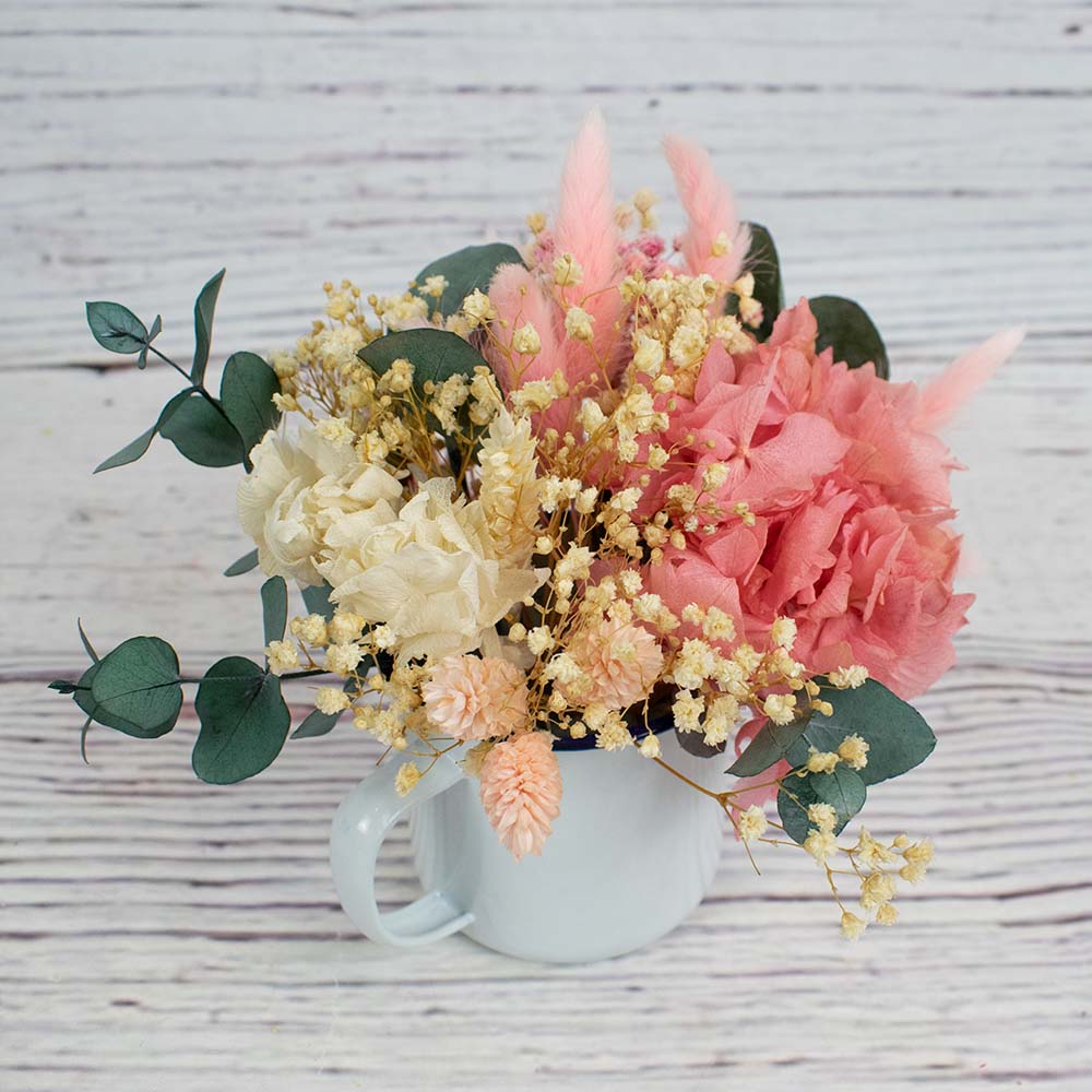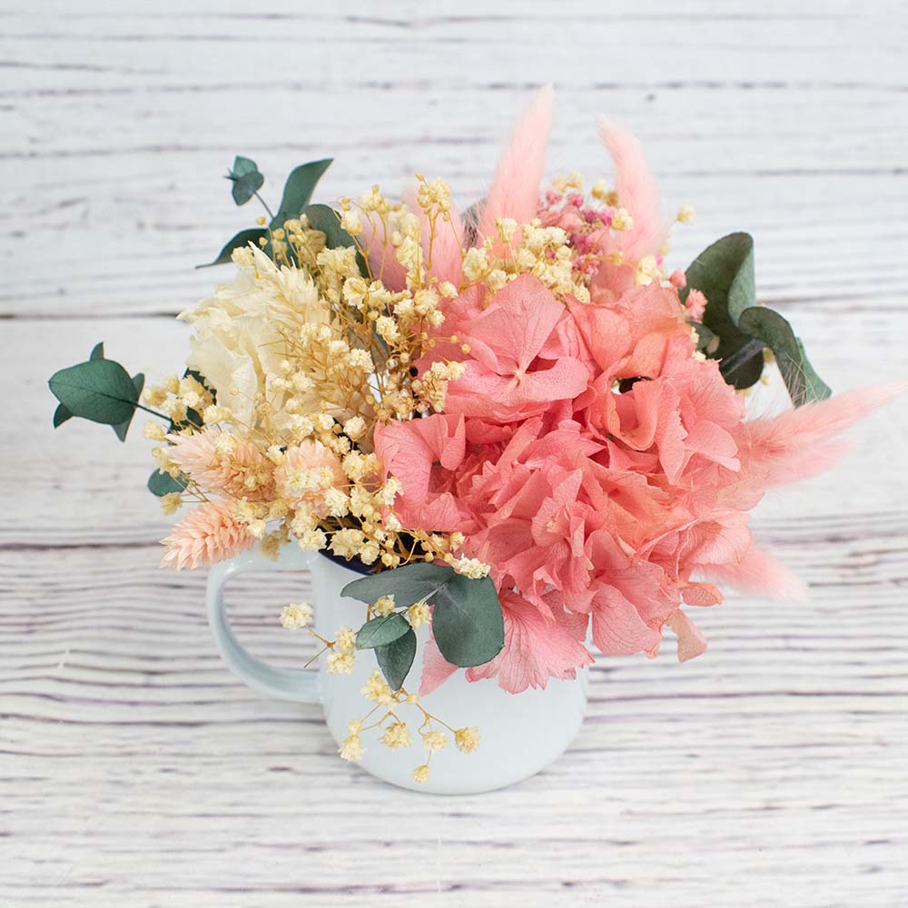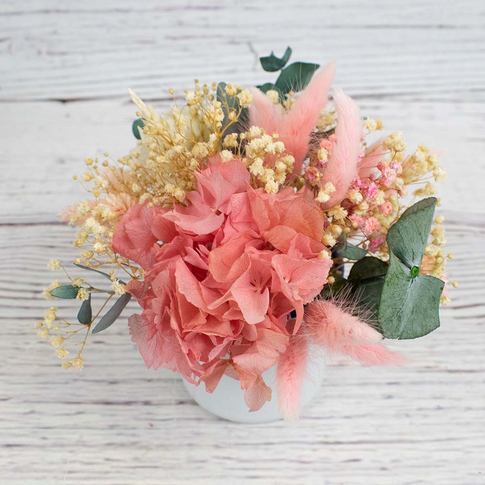 Hortensia preservada rosa y blanca, eucalipto y paniculata preservada, y flor seca blanca y rosa.