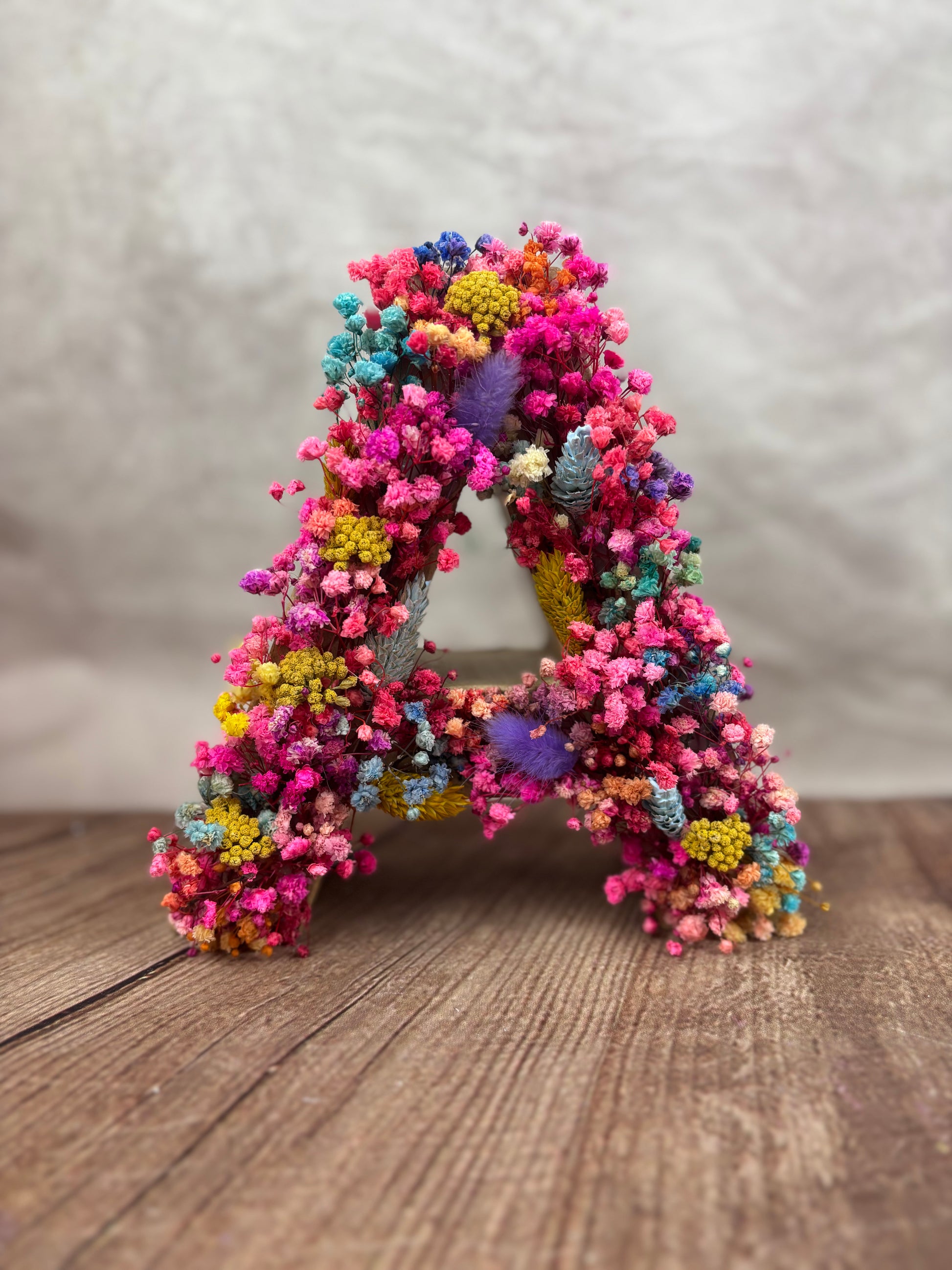Te gustan los colores variados y así de alegres? Hemos confeccionado una nueva letra con multitud de color, utilizando paniculata arcoiris y otras flores secas. Esta inicial llenará de color y alegría allá donde se ponga!