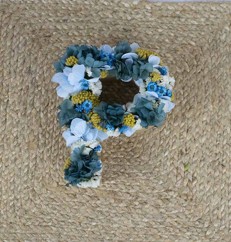Una letra con flores secas azules,blancas y amarillas es una letra de cartón decorada con flores.
