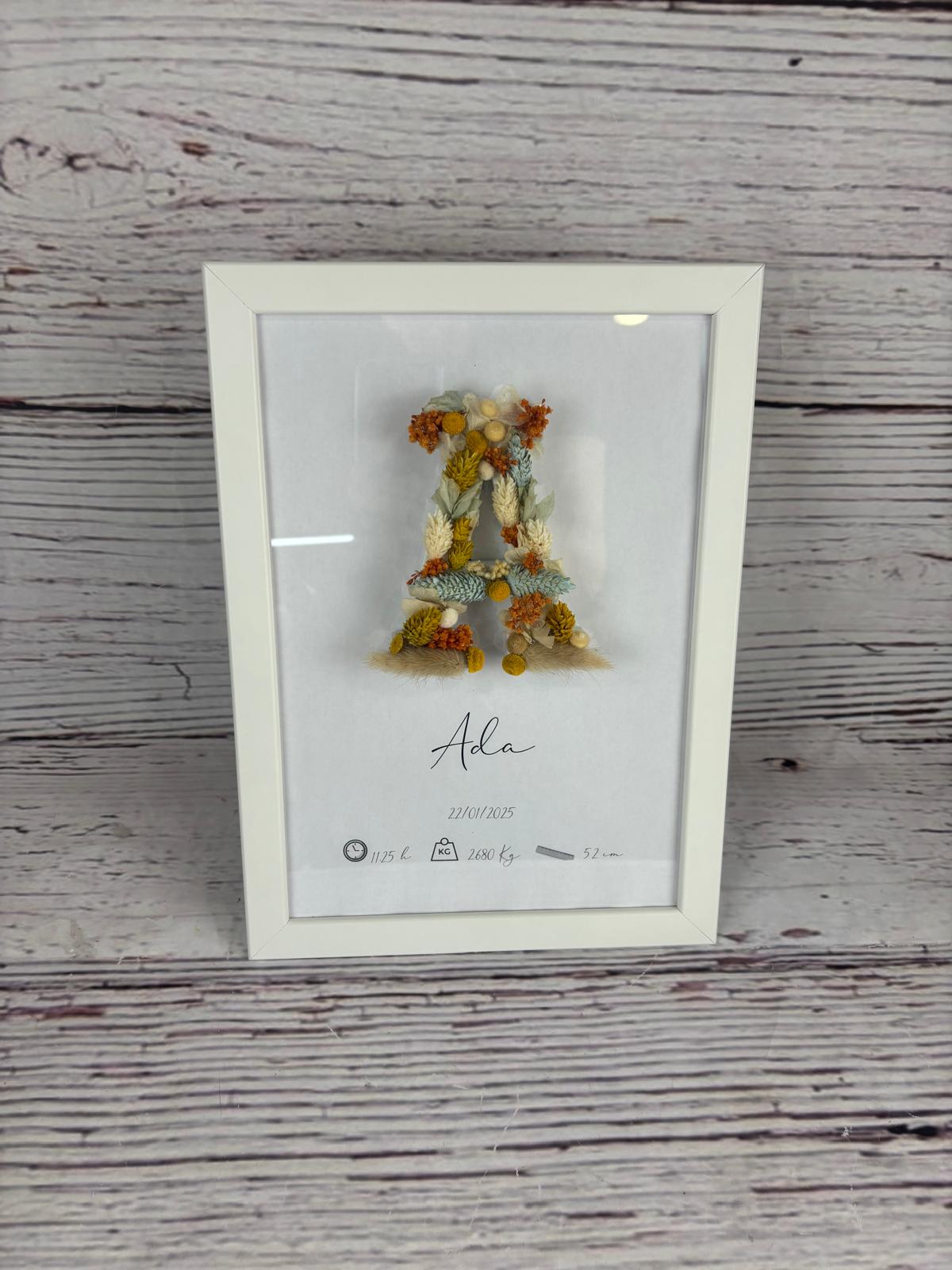 Elige la inicial de esa persona a la que quieres enviarle el marco con inicial de flores rellena de flores preservadas por el nacimiento de un bebé tan esperado. Este marco tiene una inicial de madera decorada con el nombre del bebé hecha con flores acompañada de los datos del nacimiento: fecha de nacimiento, hora de nacimiento, peso y medidas al nacer.