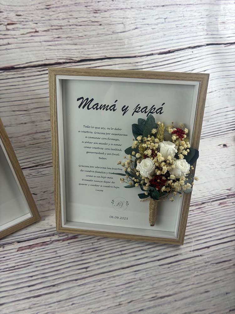 Un día especial como una boda, una fiesta familiar... Es un momento para obsequiar a esas personas que siempre están a nuestro lado, a aquellas personas que nos han ayudado en un momento de nuestra vida y lo siguen haciendo. Hay personas a las que tenemos mucho que agradecer, a las que queremos muchísimo, por eso un marco especial con un ramo personalizado, con flores que signifiquen mucho para nosotros es un regalo bonito y personalizado.
