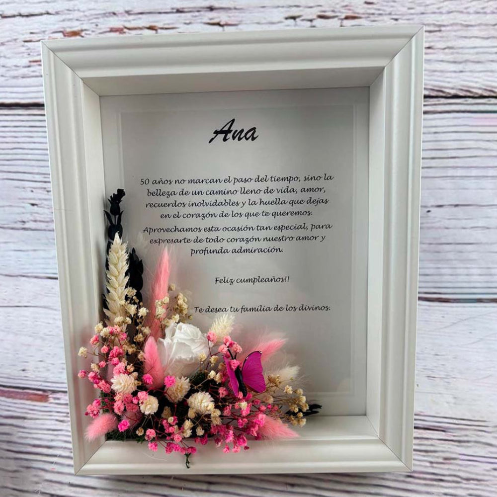 Los cumpleaños hay que celebrarlos como se merecen, como mínimo con flores y una buena tarta. Para una ocasión especial hemos confeccionado un marco nuevo donde incluimos la dedicatoria que desees acompañada de un jardín de flores.