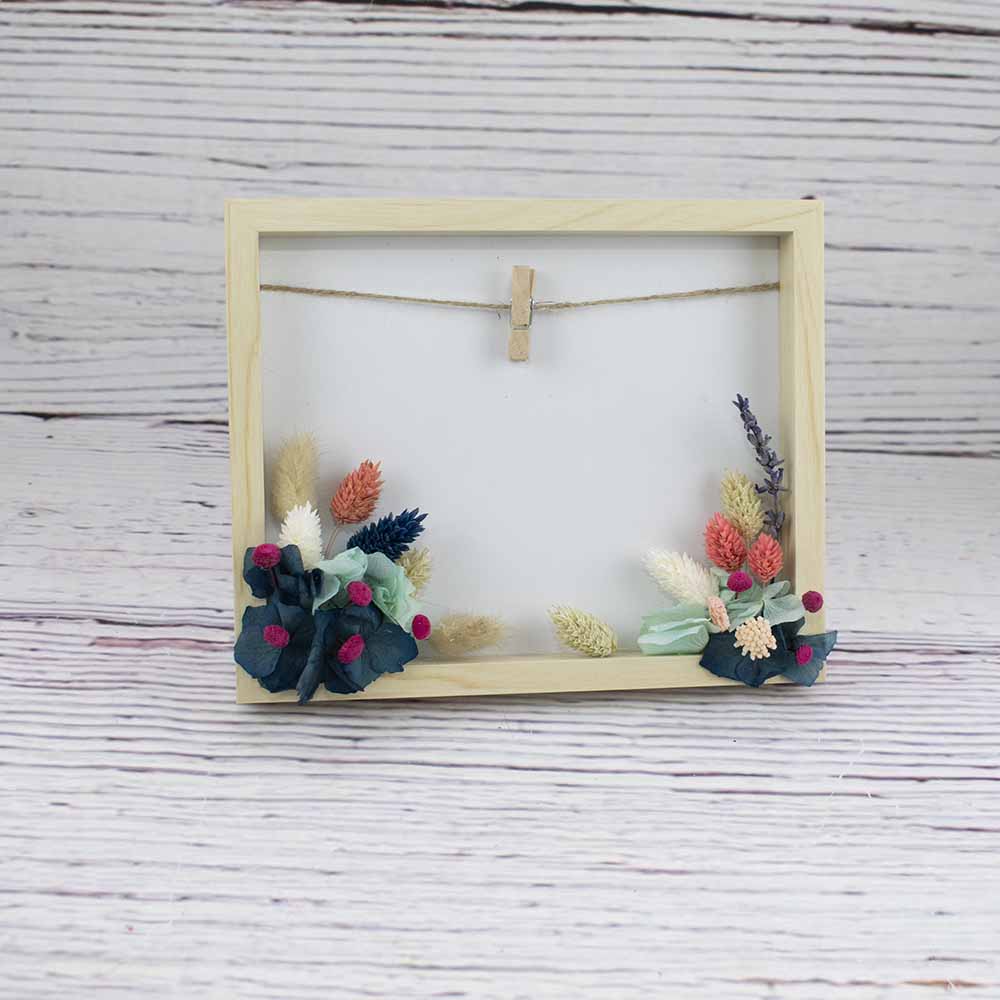 El marco de fotos de flores está decorado con flores secas y preservadas en tonos blancos, azules y rosas que les da frescura y harán que difícilmente te canses. Cuanto más lo veas, más te gustará.