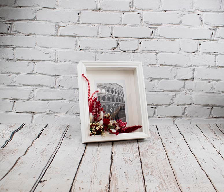 Este marco va decorado con un jardín romántico en tonos rojos y blancos con una rosa preservada.