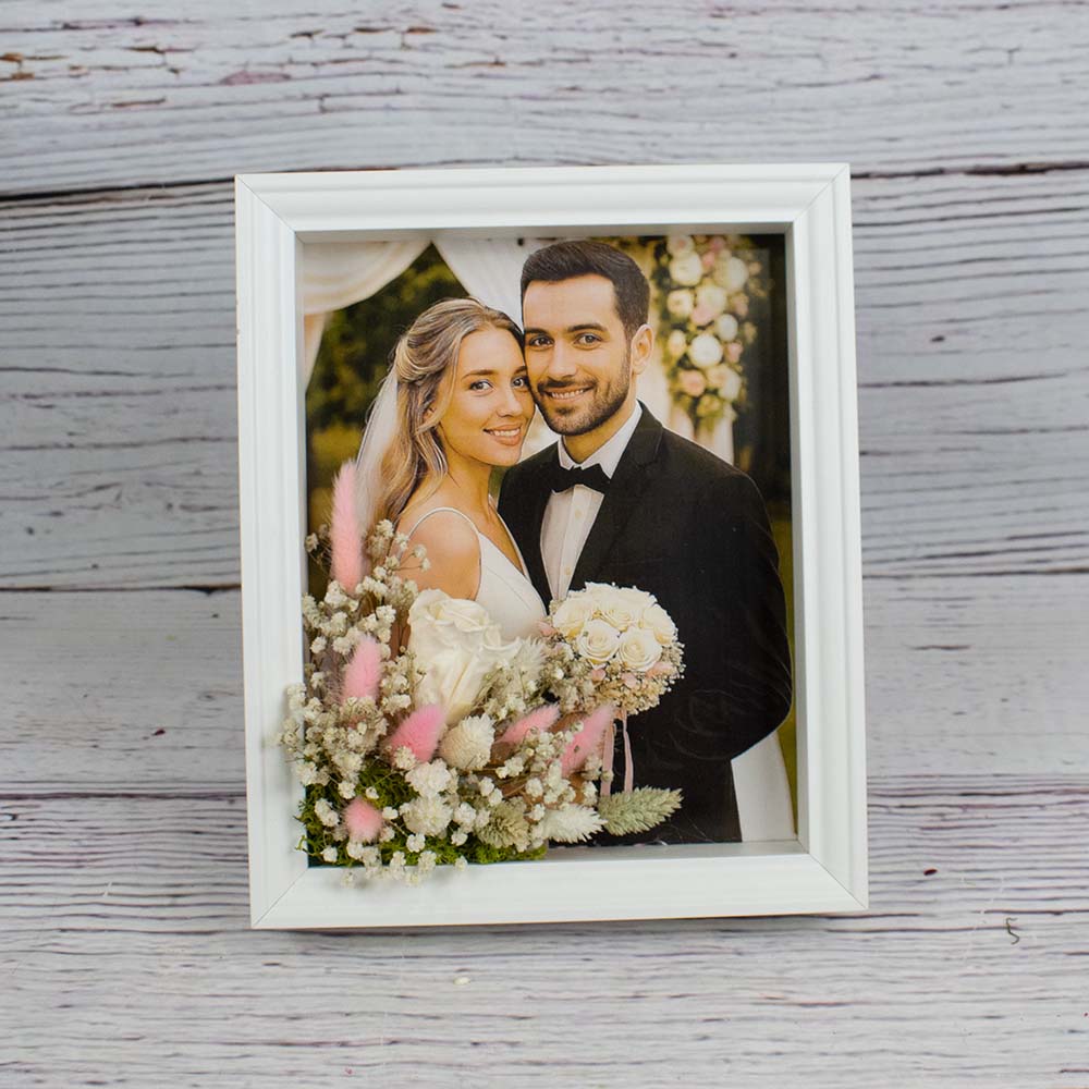 Como sabemos lo importante que es ese día, os mostramos el marco post boda. No hay nada como una foto acompañada de las flores que vivieron historia ese día. Este cuadro con foto acompañada de las flores que formaron el ramo de novia es un bonito detalle para recordar.
