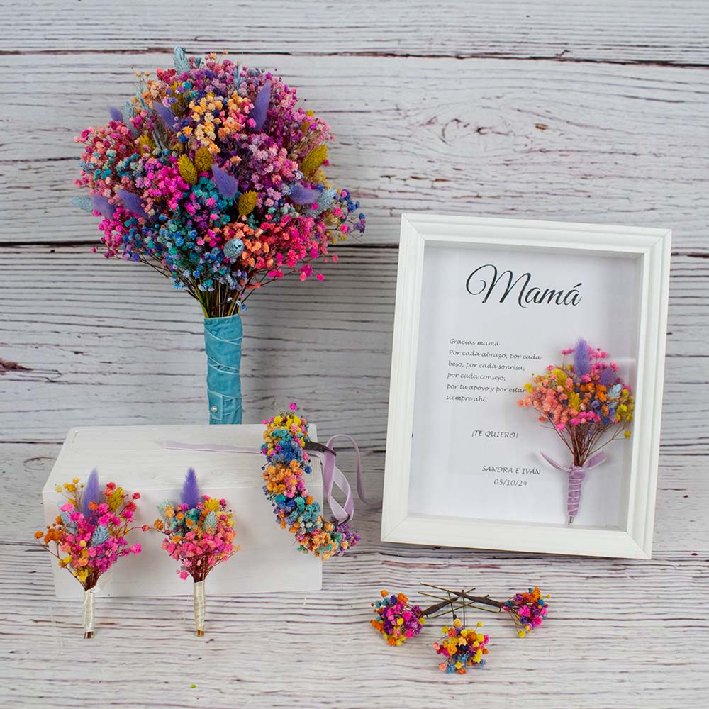 - Marco con dedicatoria personalizada: un detalle único para regalar, acompañado de un pequeño ramillete de flores preservadas a juego con el ramo elegido.