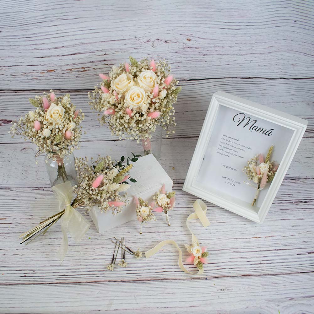 El Pack Deluxe es la elección perfecta para novias que buscan un conjunto integral, elegante y duradero, donde cada pieza refleja la esencia del ramo protagonista.