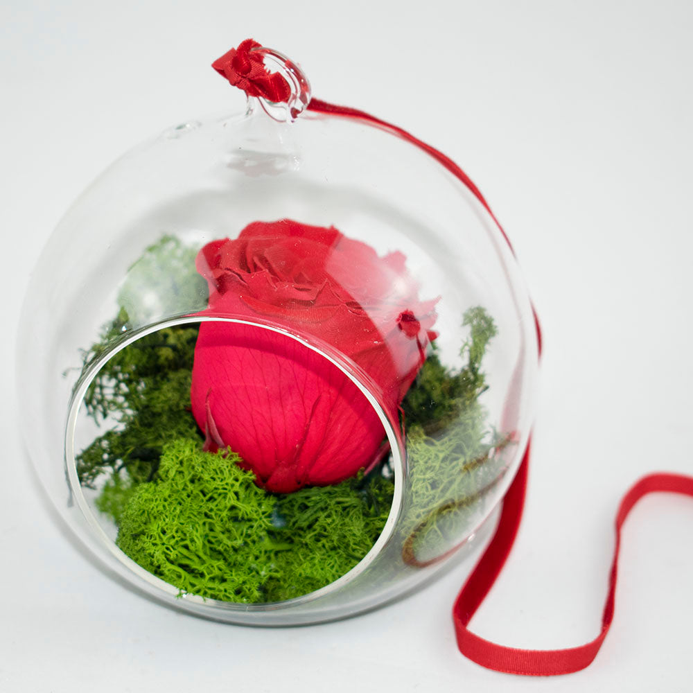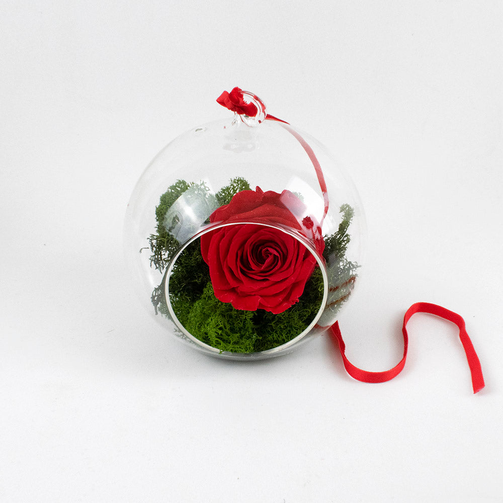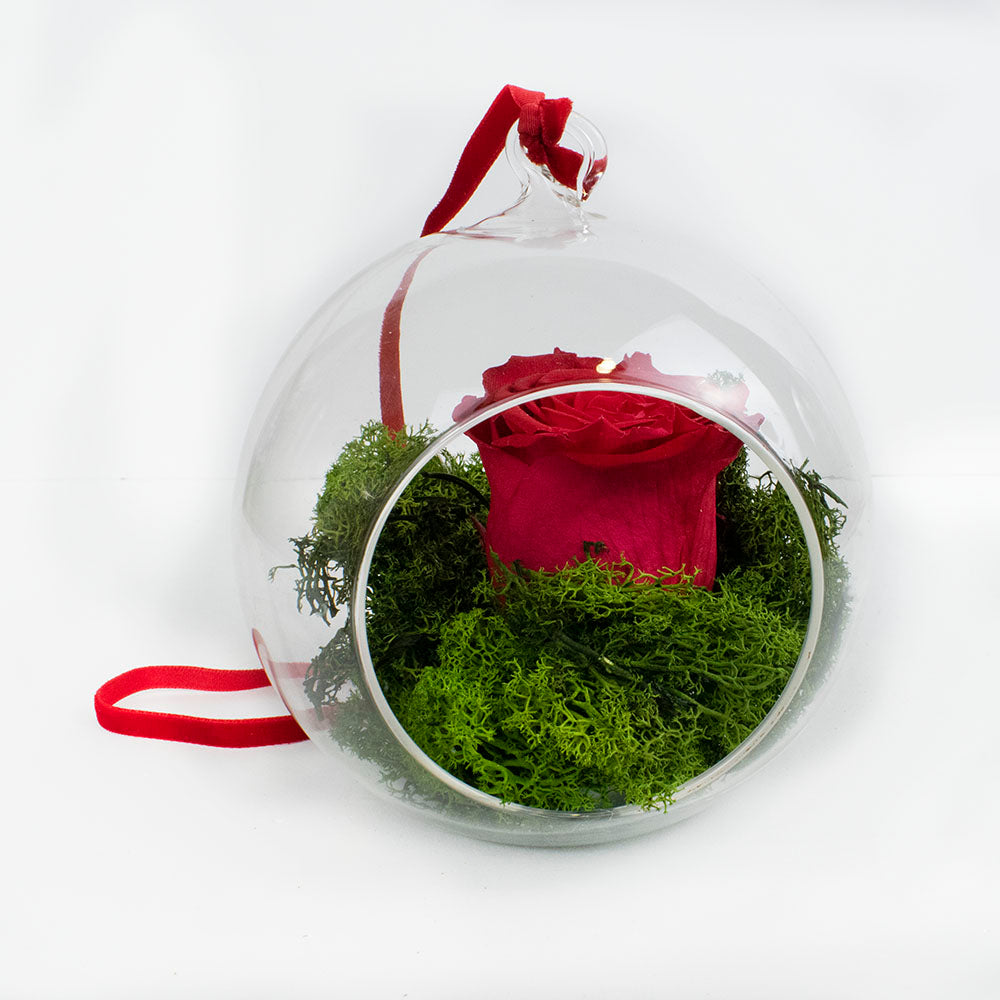 La rosa eterna, con una base de musgo artificial, se potencia y se disfruta por cualquier ángulo que se mire.