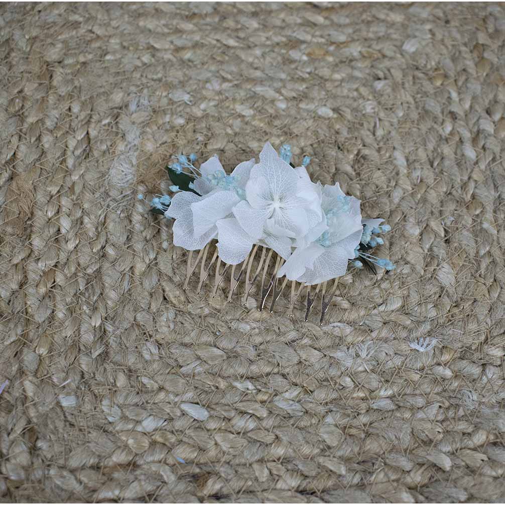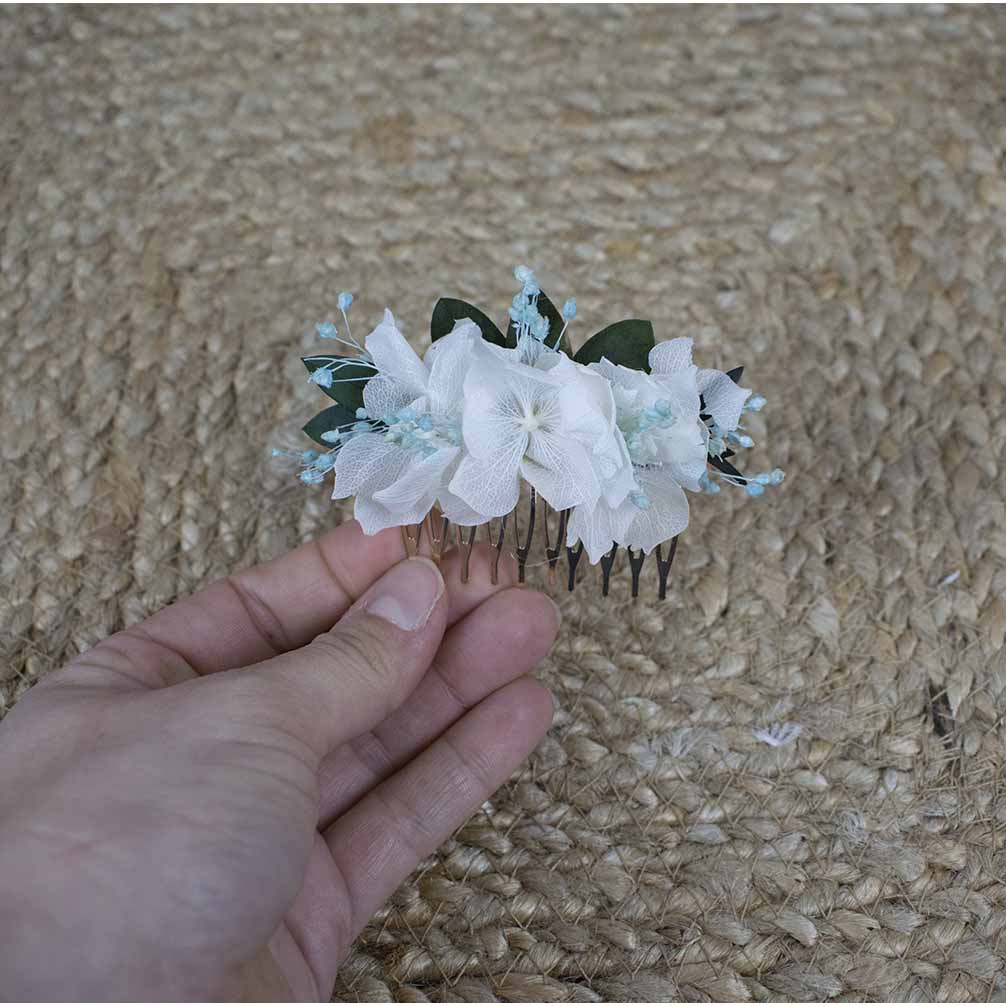 Te mostramos una peina sencilla de flores blancas de hortensia, con toque celeste y hojas en la base, Ligera, sencilla y coqueta para darle un toque a tu look.