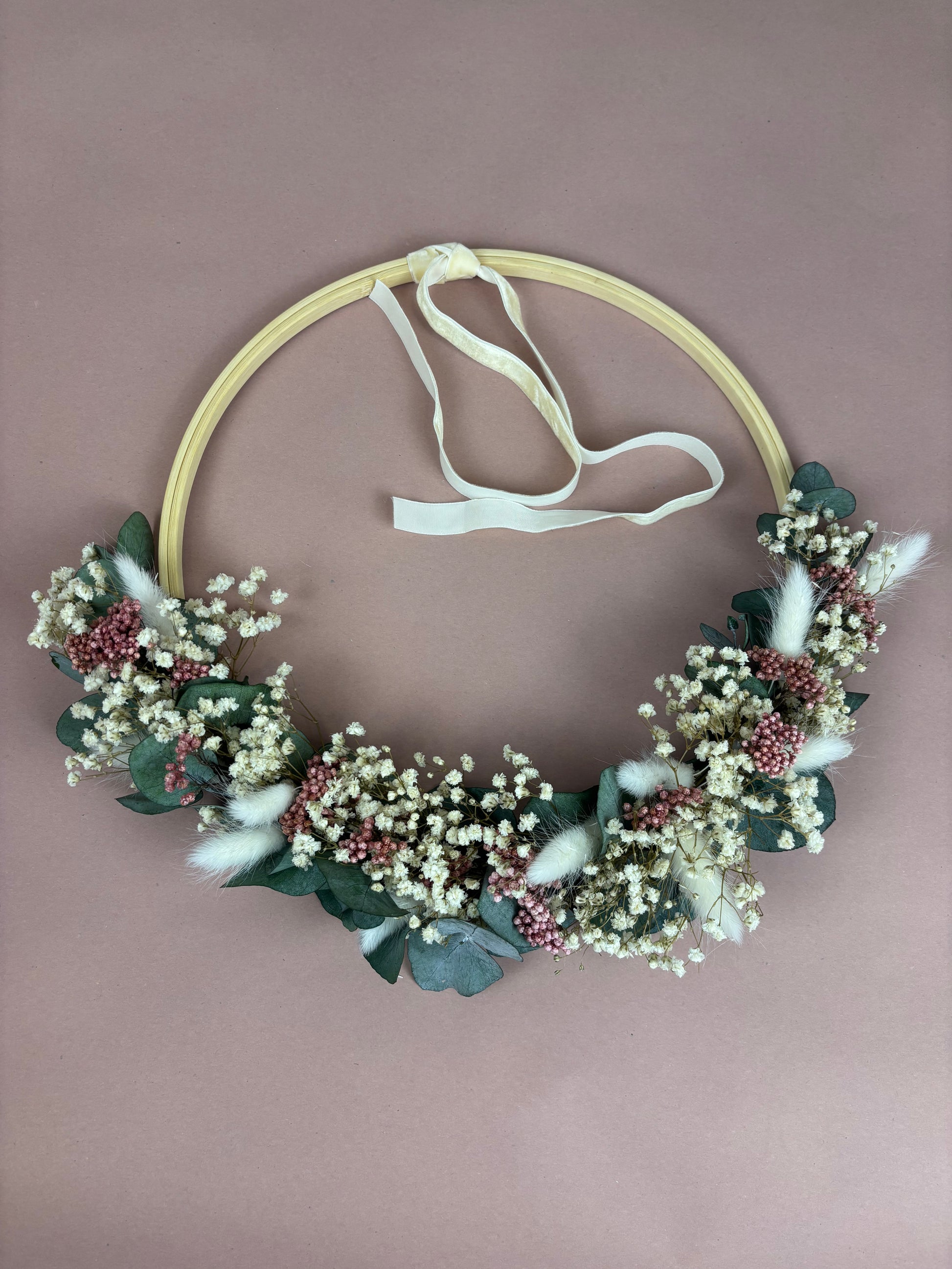 El porta alianzas destaca por ser el portador de un símbolo de unión como son los anillos de la pareja que contrae matrimonio. Este porta alianzas está decorado con flores preservadas: eucalipto, phalaris blancos y beig con Lagurus rosas.