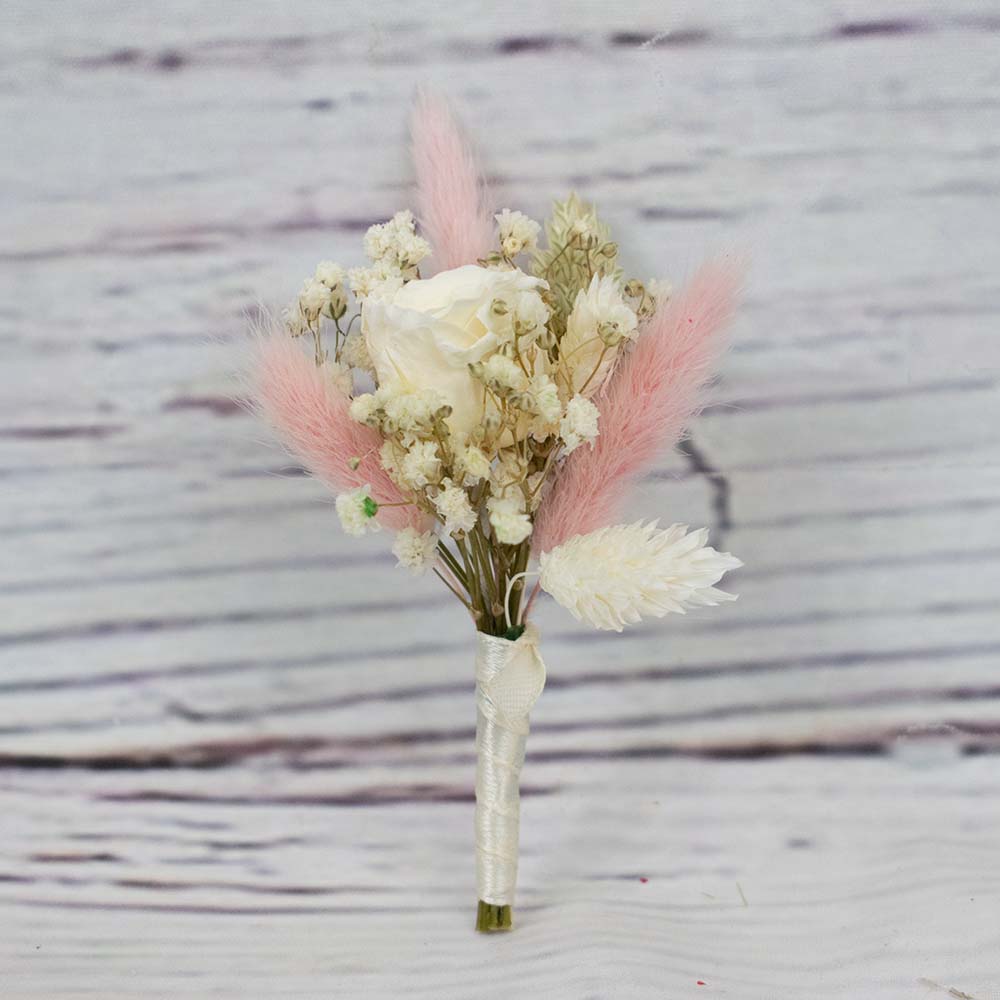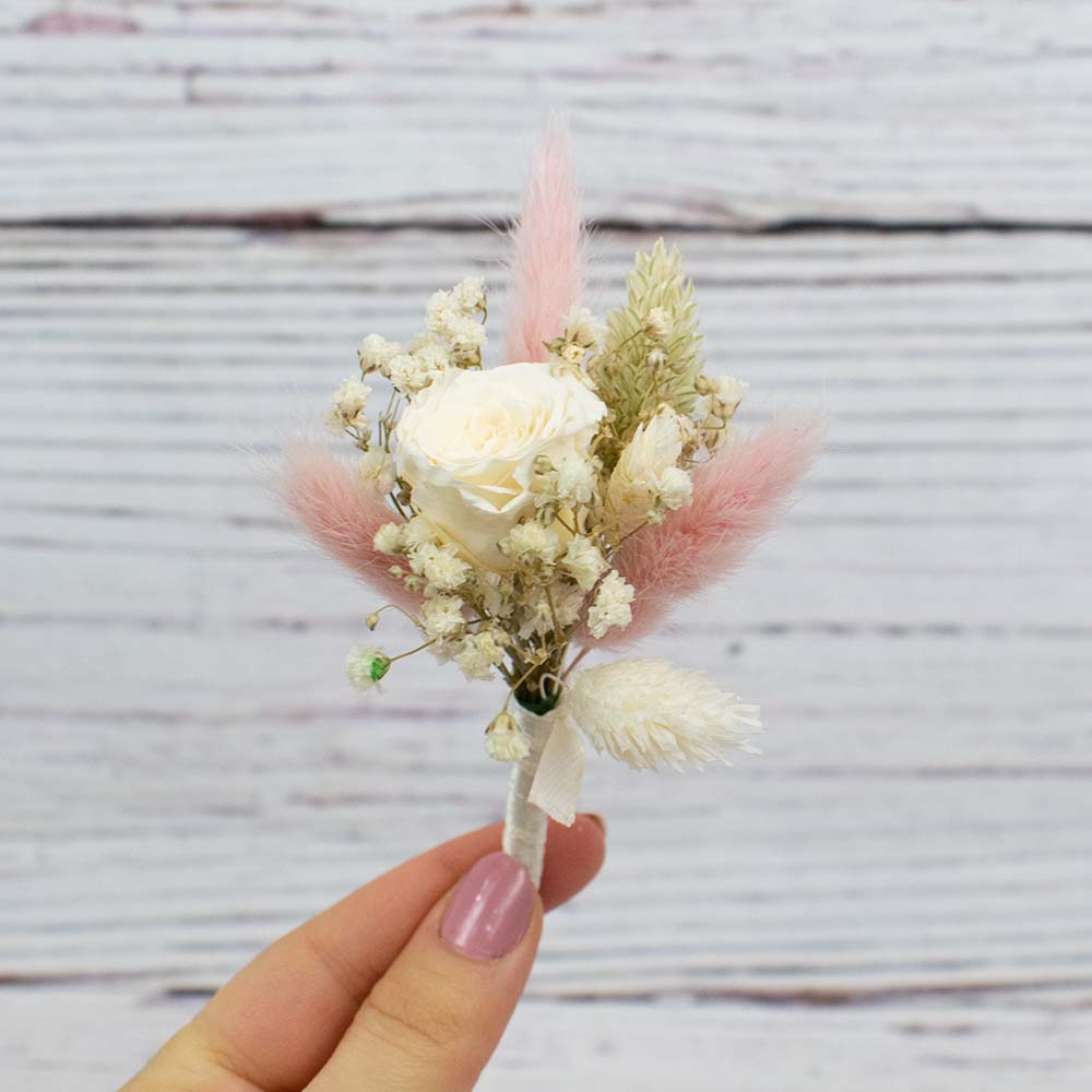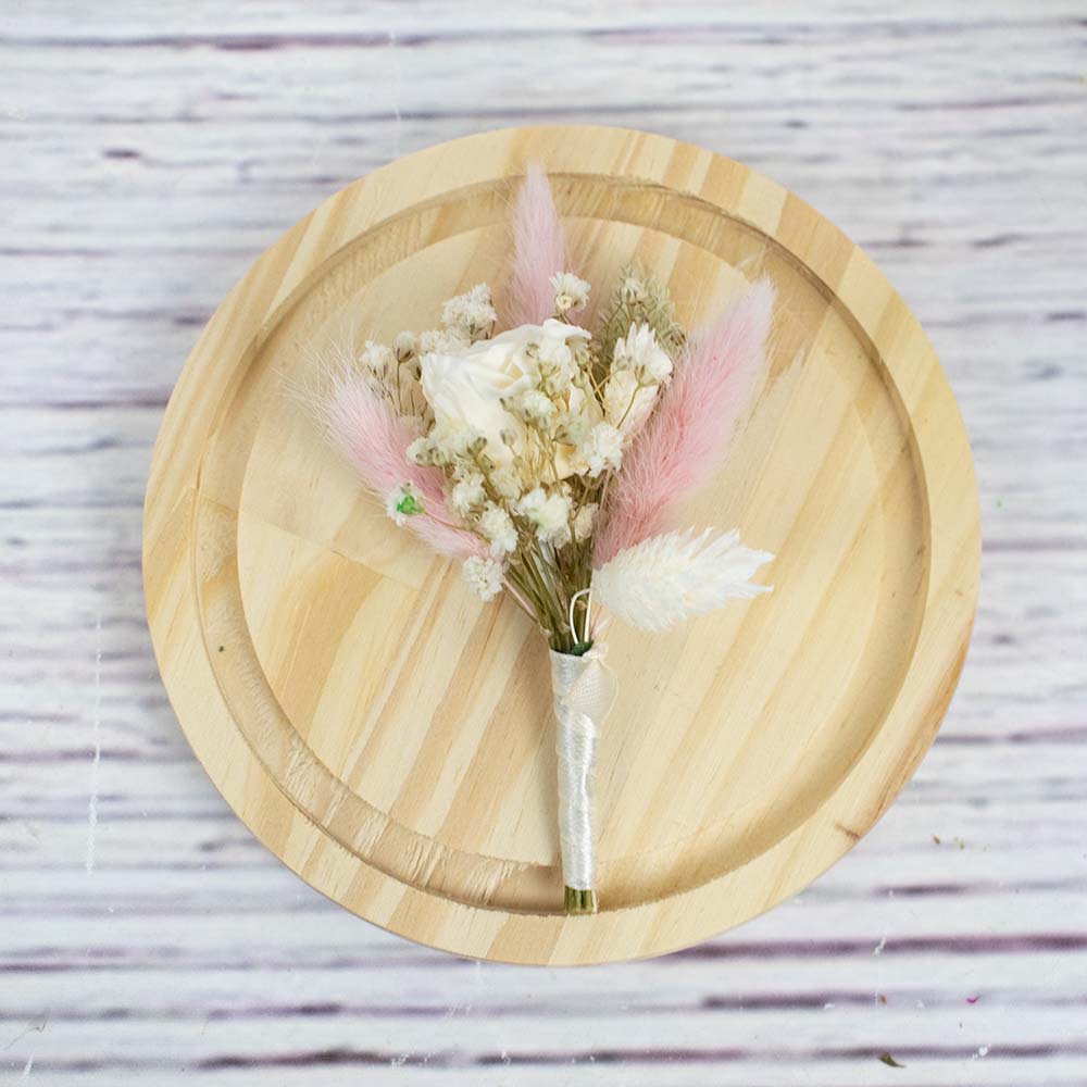 Los prendidos de nuestro taller están hechos con flor seca y preservada. Los hacemos personalizados teniendo en cuenta el ramo de novia preservado.