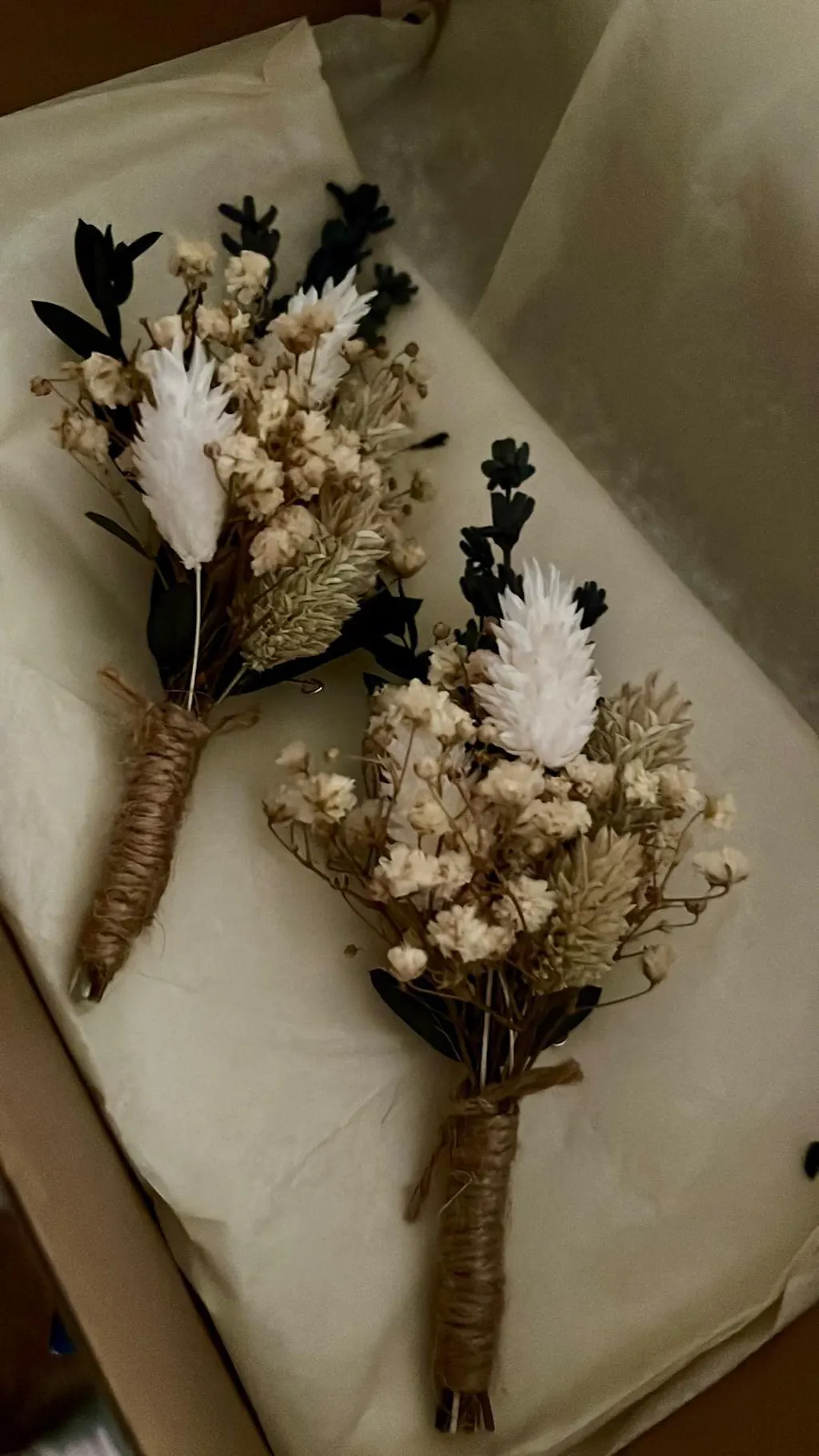 Este prendido es de paniculata preservada, phalaris blanco y natural, eucalipto parvifolia y lavanda azul. Lleva un imperdible invisible para que se puede enganchar fácilmente. El tallito está cubierto con cuerda.