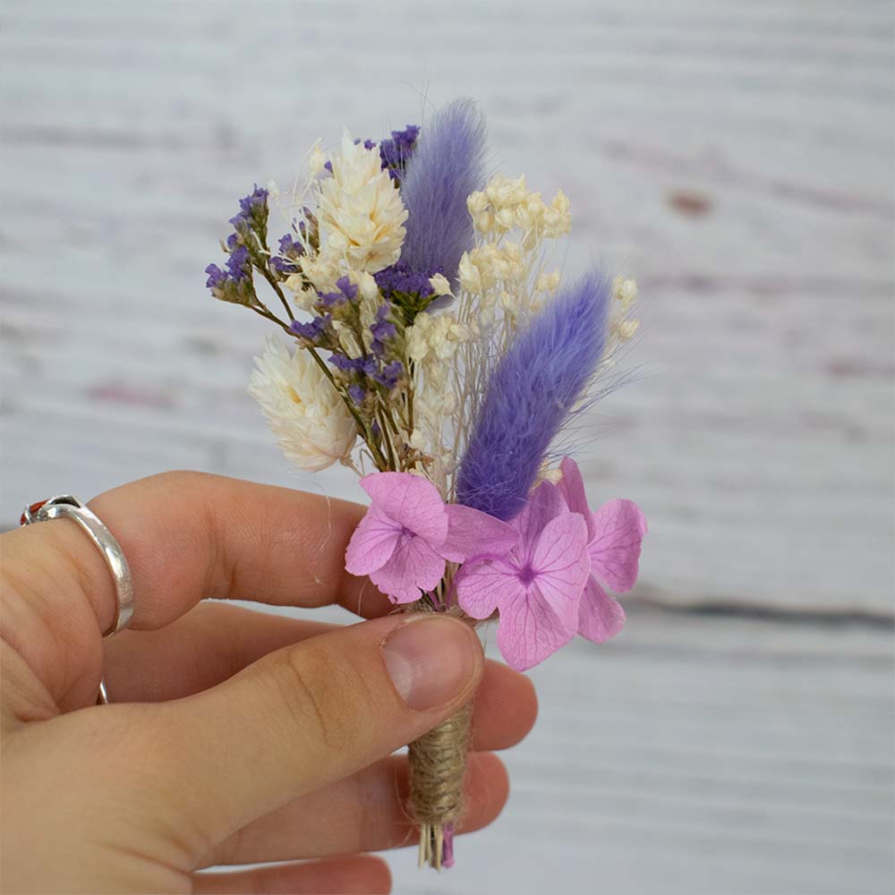 El día de la boda buscamos muchos complementos a juego. Uno de ellos es la flor en la solapa o prendido de flores para el novio y el padrino principalmente. Muchas de nuestra sparejas encargan prendidos de flores secas para sus invitados y amigos más cercanos. Tú eliges!