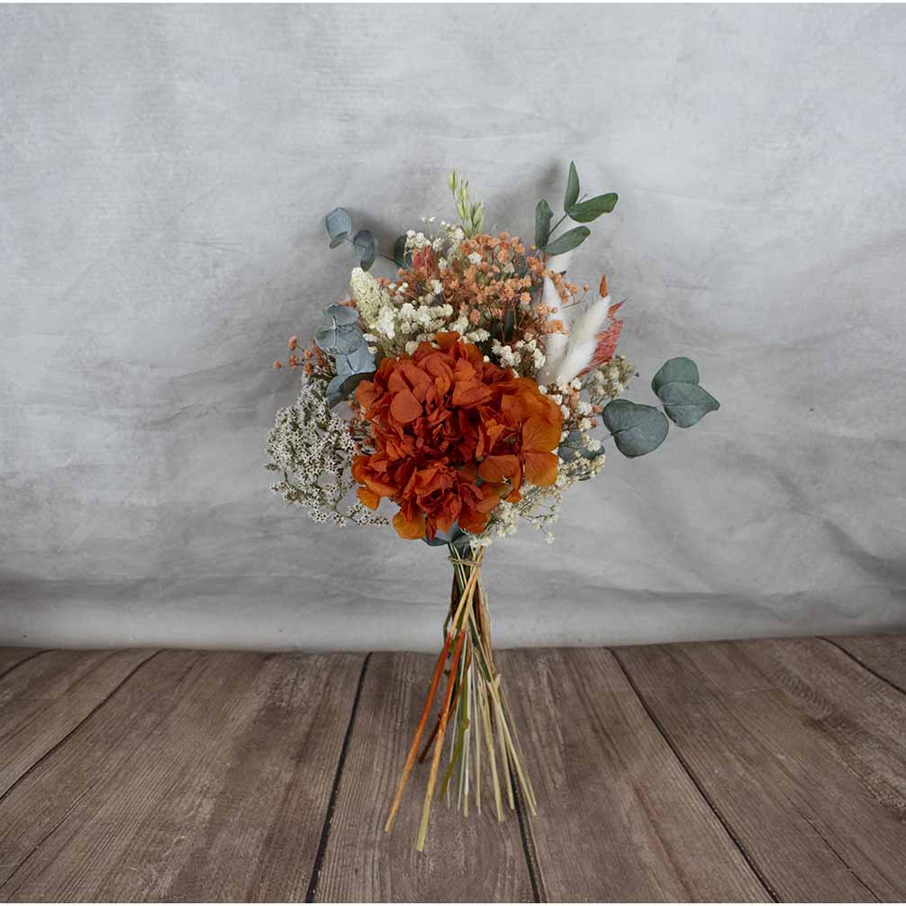 Los ramos de flores secas se caracterizan por su duración y belleza natural. Este ramo consta de una hortensia como protagonita, con flores secas y preservadas variadas. Es un ramo sencillo y pequeñopara regalar o para llevar en un evento .