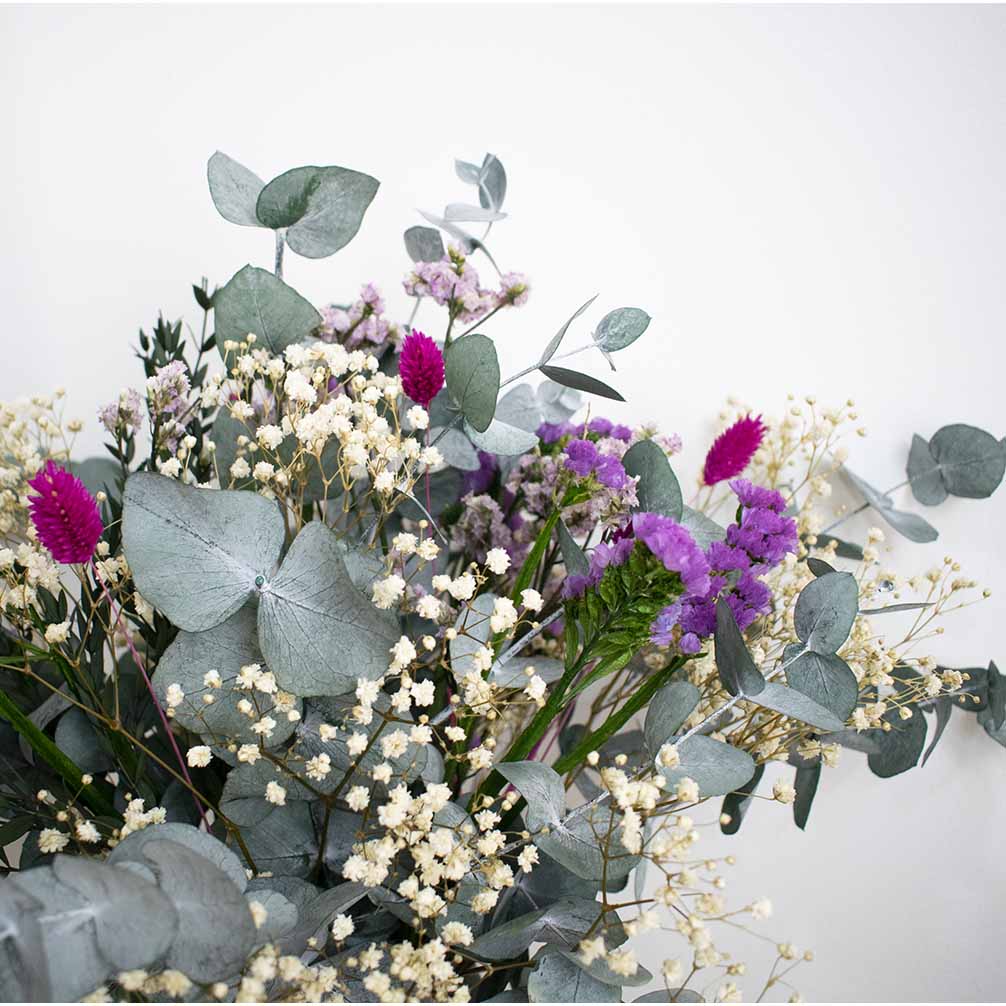 Eucalipto azulado preservado y paniculata, siempreviva rosa, phalaris rosa, limoniun rosa.