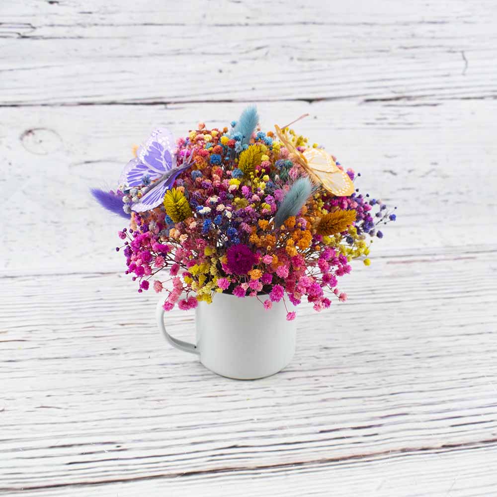 Paniculata preservada de colores con algunas flores secas de colores amarillos, rosas, azules, naranjas,.. En base de lata blanca con forma de taza y 3 mariposas variadas de color grandes o pequeñas (en función del modelo que elijas)