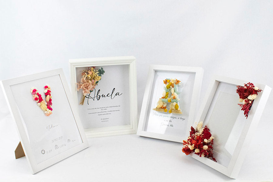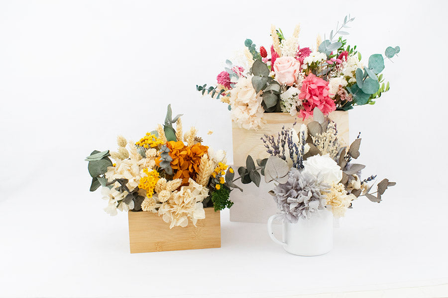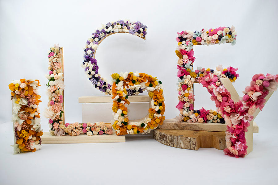 Ramos con flores eternizadas, centros de flores secas que te hacen abrir los ojos de par en par, letras con flores presevadas que marcan a quién la recibe o cuadros de flores preservadas son algunos de los artículos que ha salido, salen y saldrán de nuestro taller.